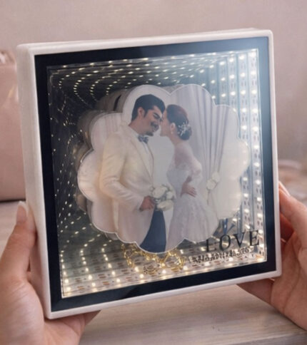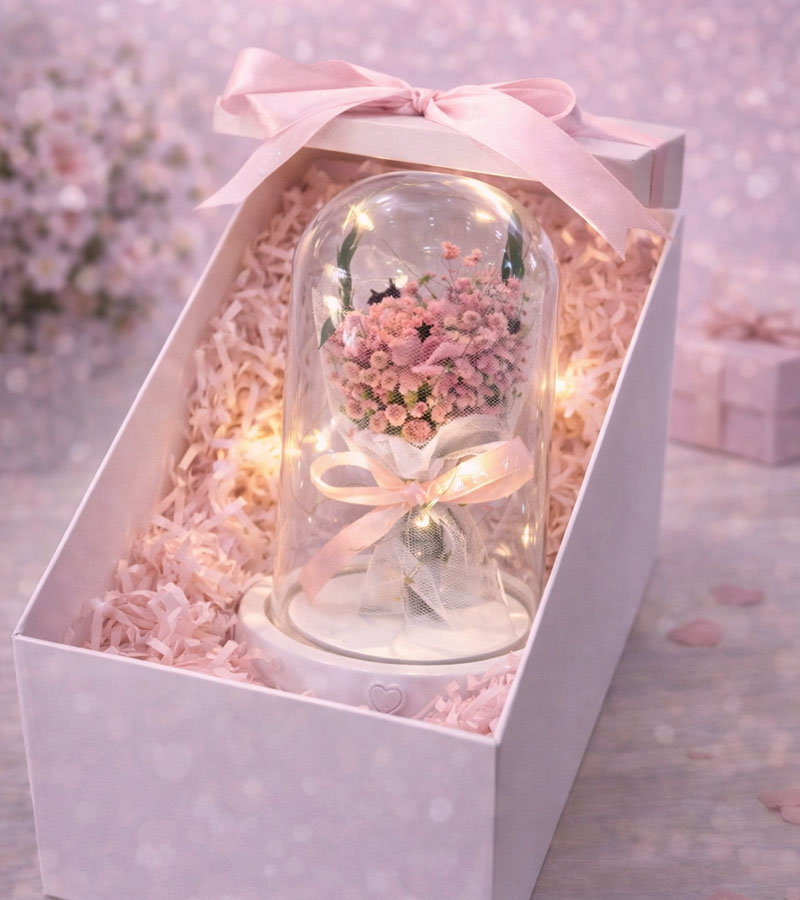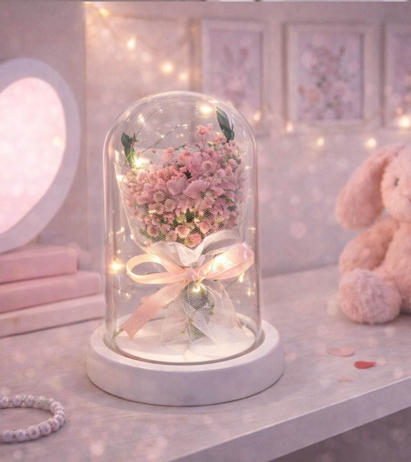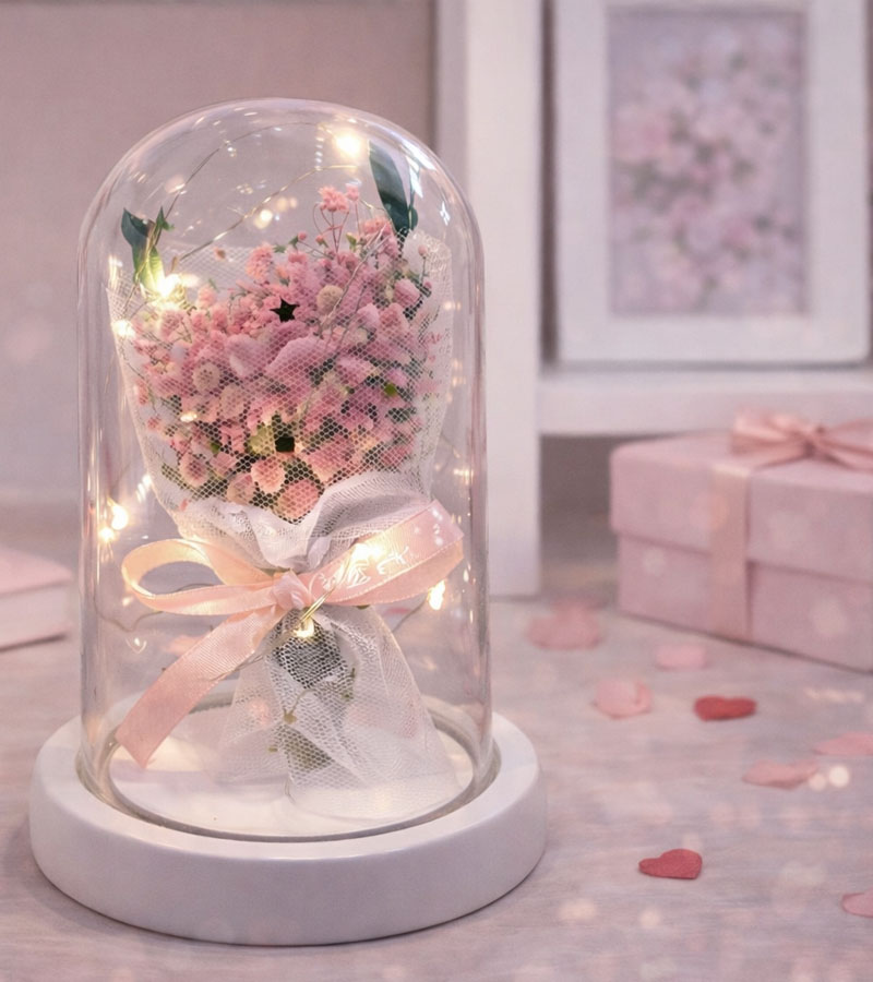De delicate bloemen zijn zorgvuldig geplaatst onder een glazen dome en omringd door zachte LED-lichtjes die een romantische en rustgevende sfeer creëren.