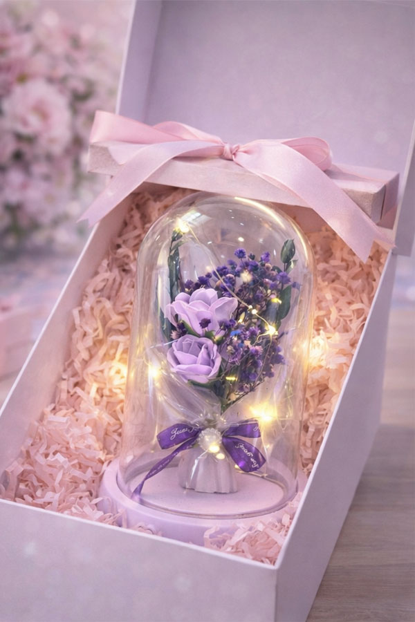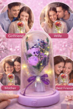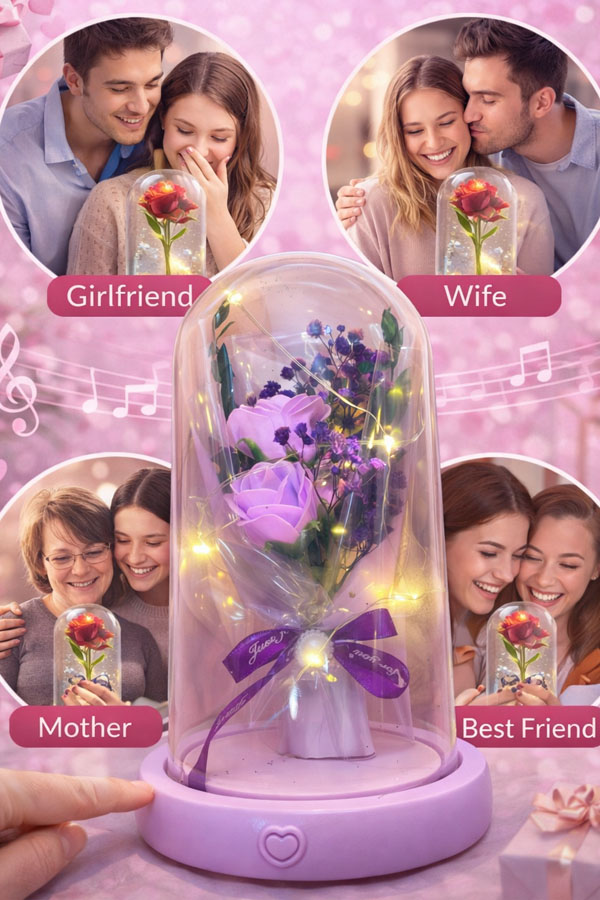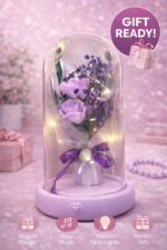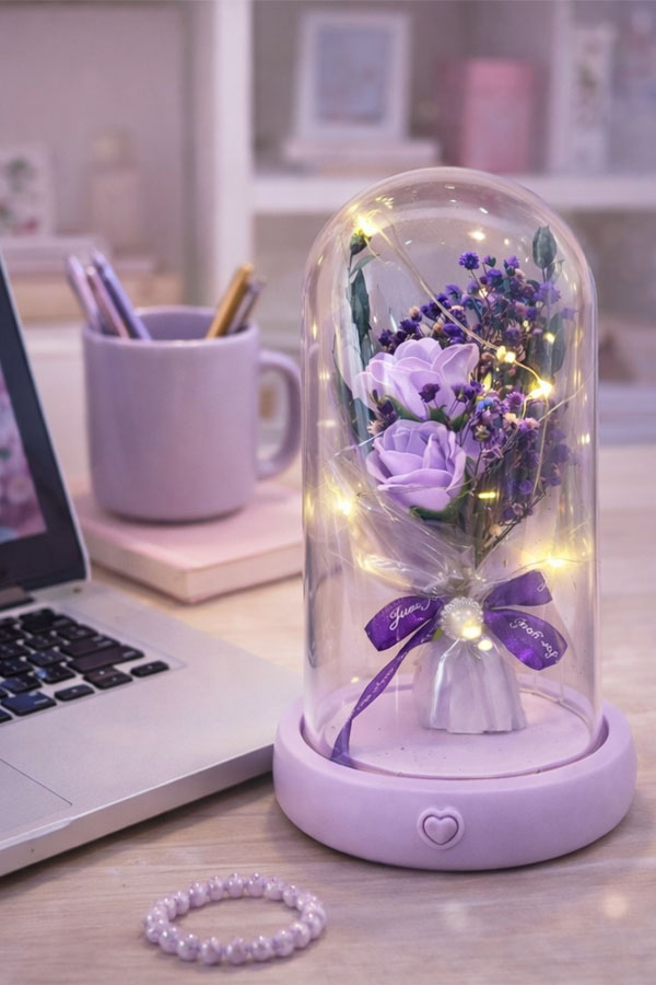 Omringd door zachte LED-lichtjes creëert de paarse roos een warme en romantische sfeer, perfect voor op een bureau, plank of nachtkastje.